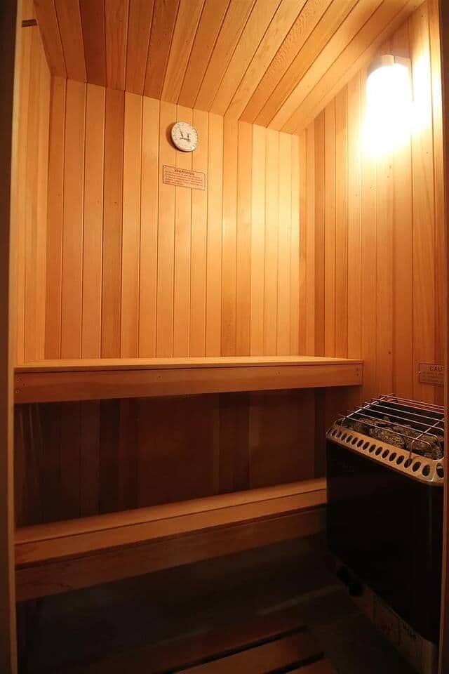 This master bathroom has two sinks, a jacuzzi tub, a steam shower, and a sauna.